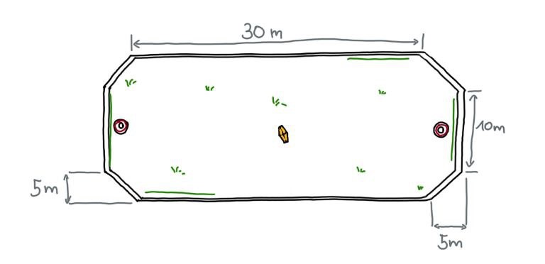 Es gibt zwei Teams von jeweils fünf Personen die sich auf einem achteckigen 20 mal 40 Meter großen Feld gegenüber stehen.