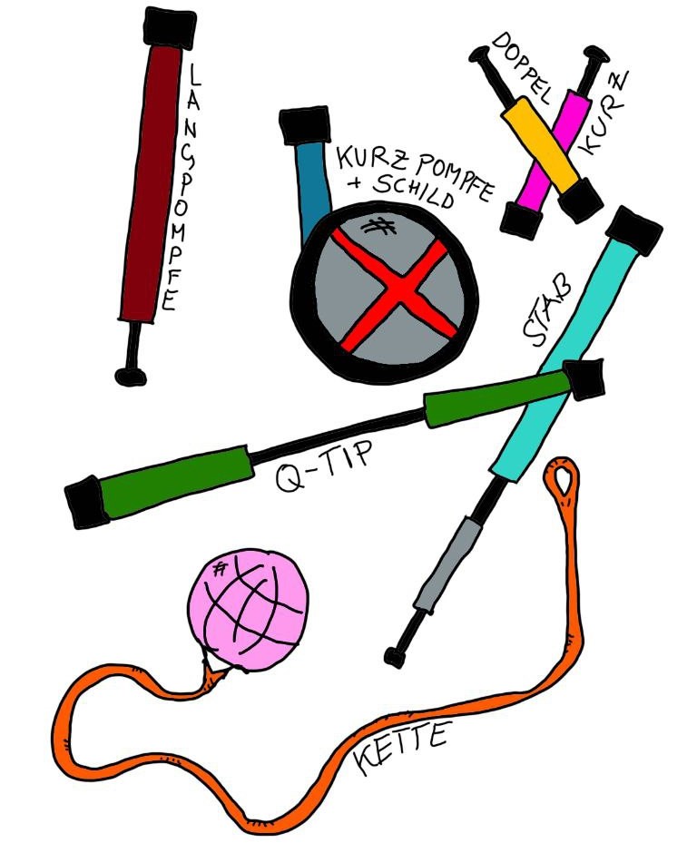 Die restlichen vier Spieler*innen des Teams sind „bewaffnet“ mit diversen Pomfen und müssen versuchen ihre Duelle mit den Spieler*innen des gegnerischen Teams zu gewinnen und der laufenden Person freie Bahn zum Mal zu verschaffen.